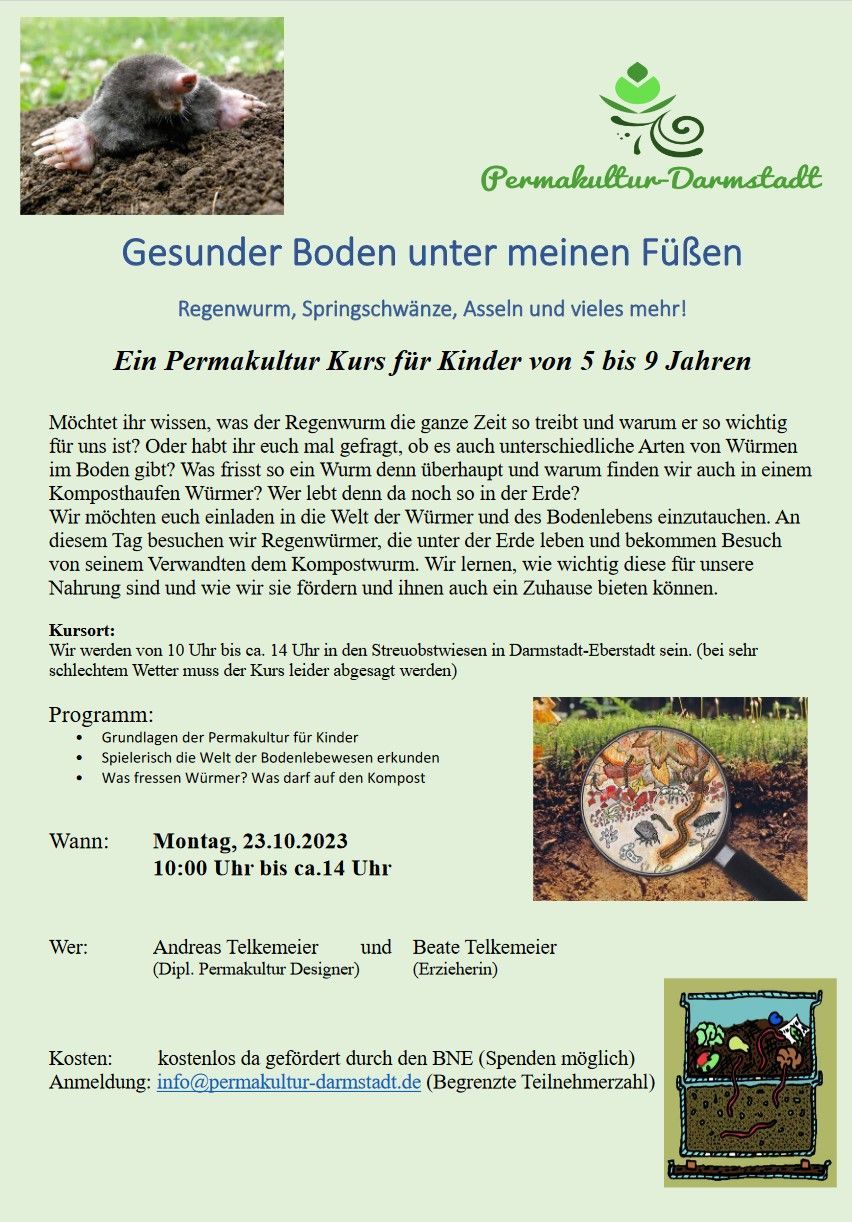 Wir möchten euch einladen in die Welt der Würmer und des Bodenlebens einzutauchen. An diesem Tag besuchen wir Regenwürmer, die unter der Erde leben und bekommen Besuch von seinem Verwandten dem Kompostwurm. Wir lernen, wie wichtig diese für unsere Nahrung sind und wie wir sie fördern und ihnen auch ein Zuhause bieten können. Anmeldung an: info@permakultur-darmstadt.de